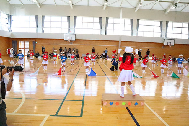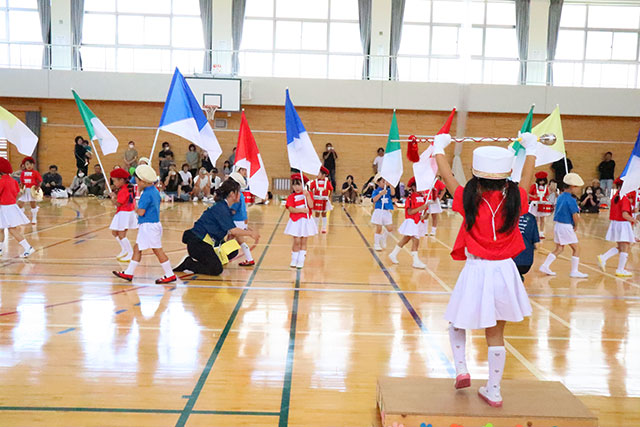 年中・年長による『鼓隊パレード』。聞き馴染みのある「おもちゃのチャチャチャ」に合わせて、旗を振ったり、太鼓を叩いたりして、とても素敵な運動会のオープニングになりました♪