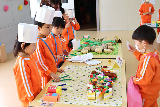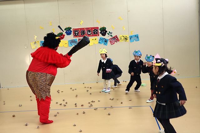 そのあとは、園庭でスイカ割り。いろんな目をしたアイマスクをもらい、お互いのアイマスクを見て、みんな大笑い!その後、スイカを食べ、種飛ばし競争。遠くまで飛ばしたくて、スイカもたくさん食べました。